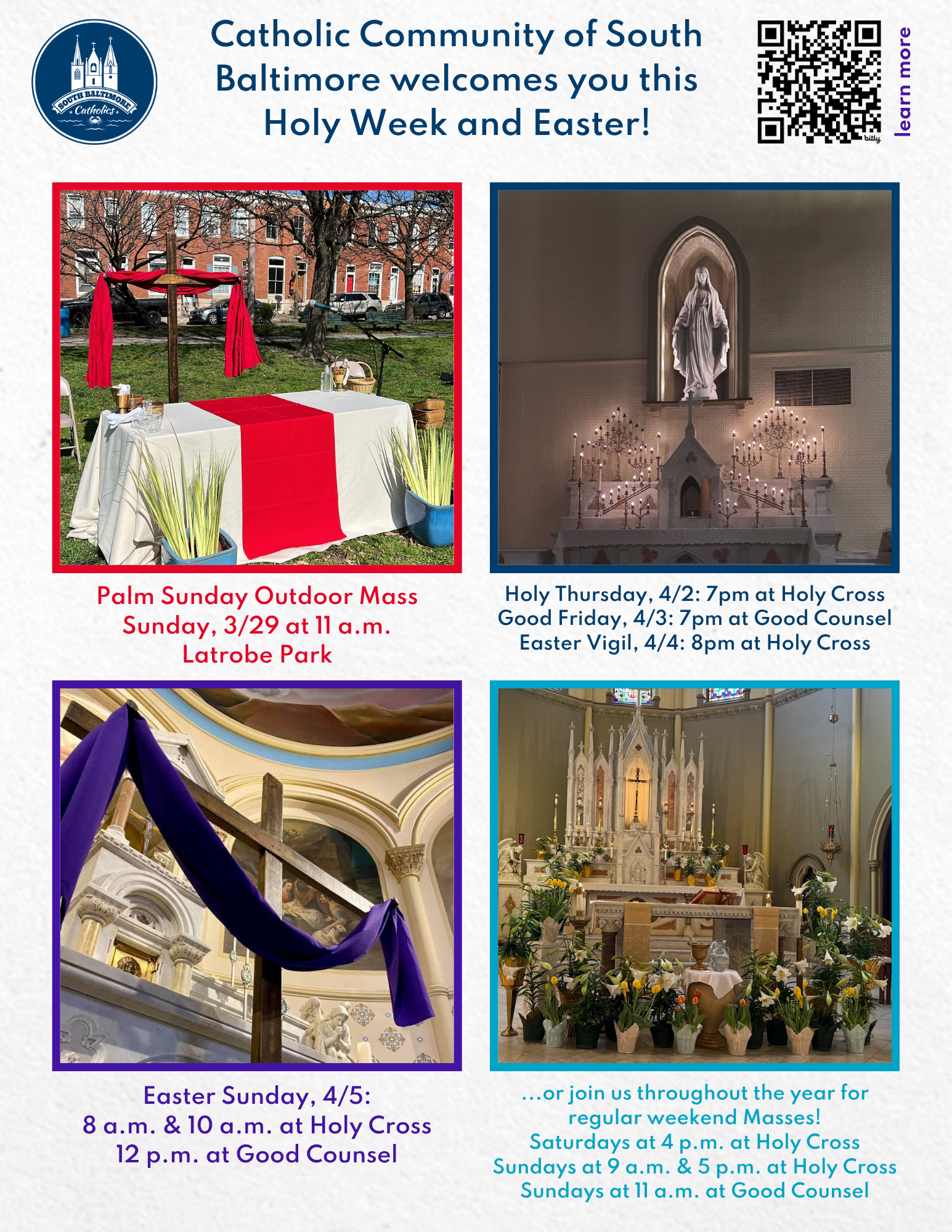 Welcome to the Catholic Community of South Baltimore (CCSB)! We are so happy you’ve joined us. Our parish is comprised of Holy Cross Church and Our Lady of Good Counsel Church. At CCSB, we are united in our mission to know, love, and serve God and our neighbor. We look forward to meeting you soon!